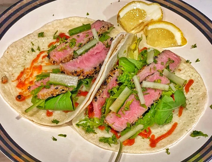 - Plate tacos and dress with hot sauce, arugula, tuna, cilantro and cucumber. Garnish plate with lemon wedges. Enjoy!