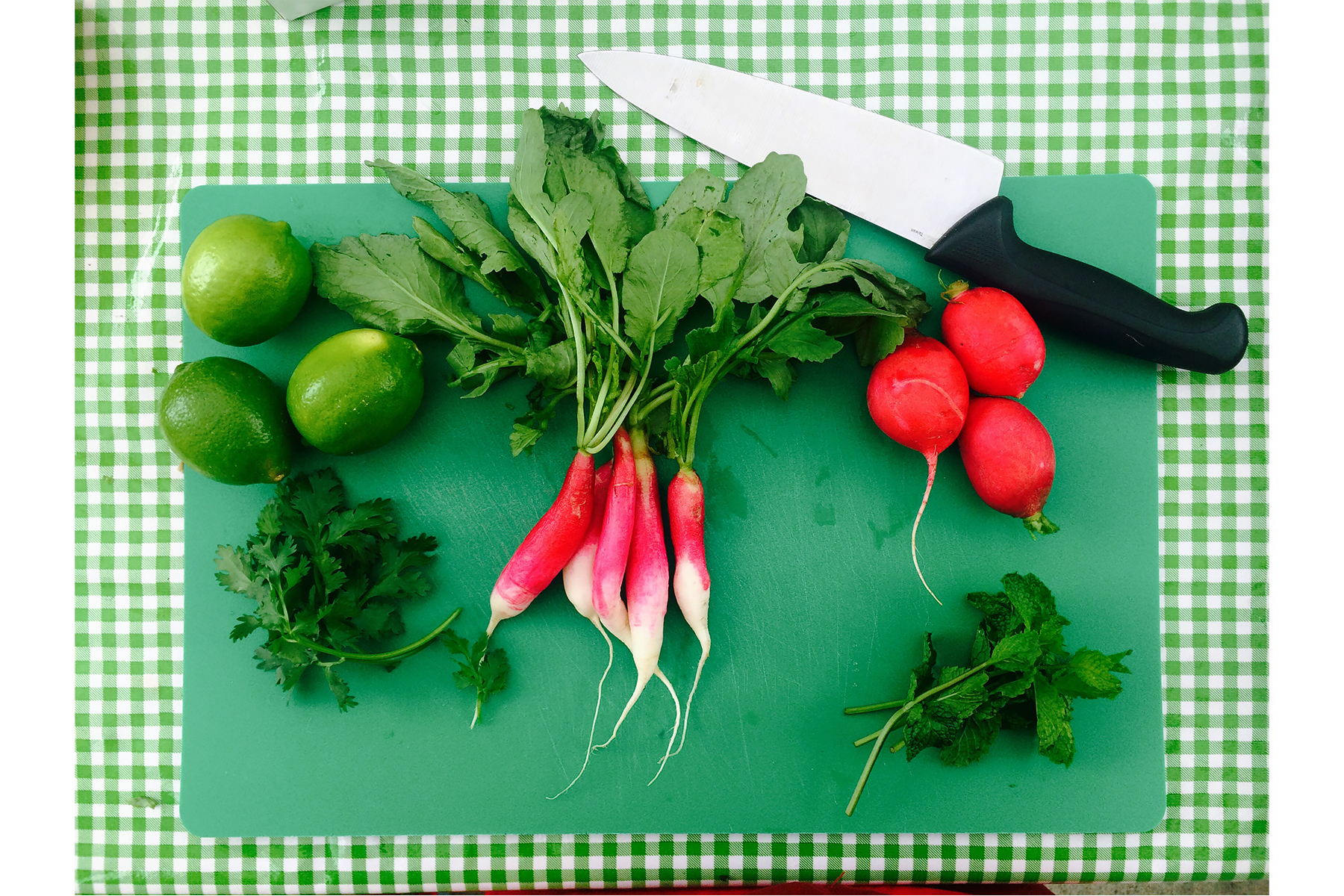 - Slice tops off radish and set aside. Chop the French radish and round radishes, and place in a bowl.